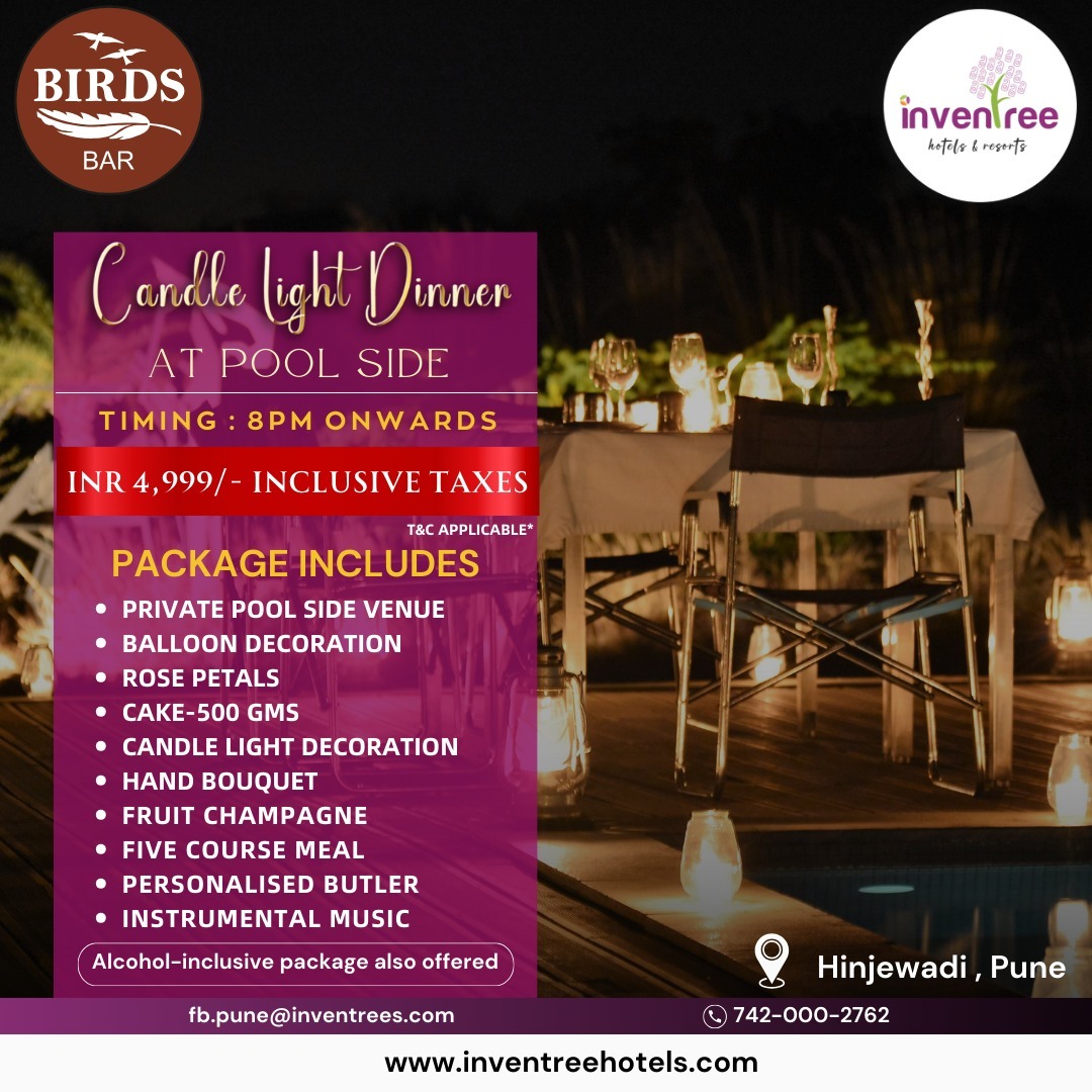 Enjoy candle light dinner at the poolside for an exclusive package of Rs.4999/- only which will start from 8 P.M onwards.